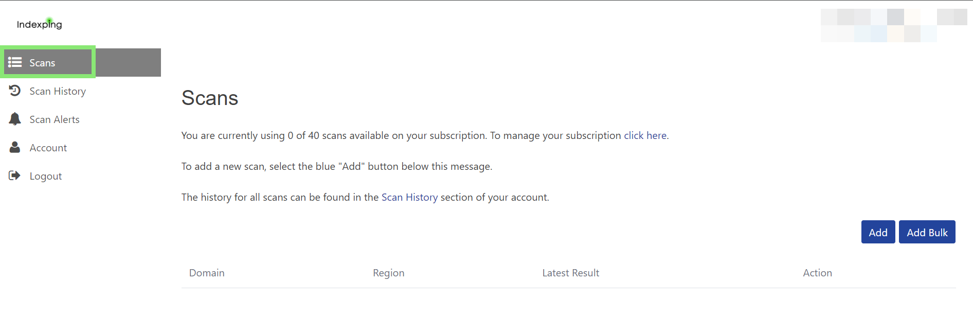 Step 1. Log into your Indexping dashboard and select the Scans tab from the left-hand navigation menu.